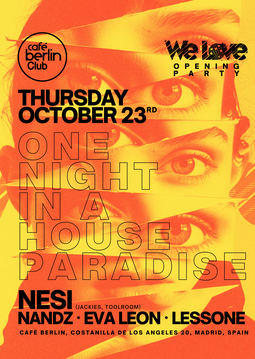 We Love llega a Berlín Club con una nueva edición dedicada al house más vibrante. Un evento que se celebra en los principales clubes del país y que combina la energía de la pista con un show compacto, performances exclusivas y experiencias inmersivas diseñadas para rendir homenaje a la música electrónica por excelencia.